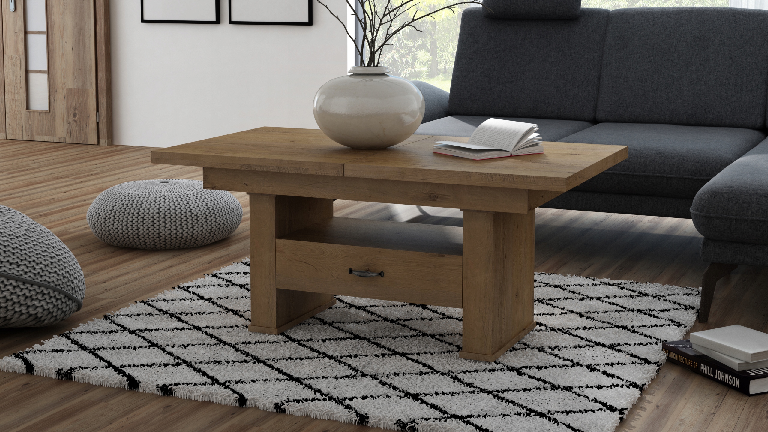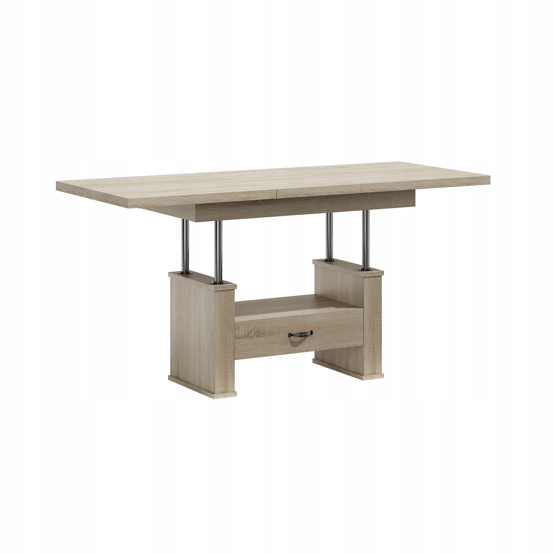 Oferujemy Państwu wysokiej jakości ławo - stół zaprojektowany z myślą o kompleksowym wykorzystaniu powierzchni małych pokoi. Ława posiada funkcję rozkładania na prowadnicy linkowej ciągnąc za jedną połówkę blatu druga rozciąga się samoczynnie oraz podnoszenia.na podnośnik czteropunktowy .Sprawdzi się zarówno jako stolik kawowy jak i stół dla całej rodziny w czasie niedzielnego obiadu.Ława jest wykonana z płyty obustronnie laminowanej. Materiał ten charakteryzuje się zwiększoną odpornością na uszkodzenia mechaniczne, zarysowania, oddziaływanie wysokich temperatur. Nie zaszkodzi mu gorąca szklanka postawiona bezpośrednio na blacie.Krawędzie blatu wykończone są obrzeżem PCV zabezpieczającym elementy ławy przed uszkodzeniami mechanicznymi.Wkładki nie mieszczą się pod blatem chowamy osobno.