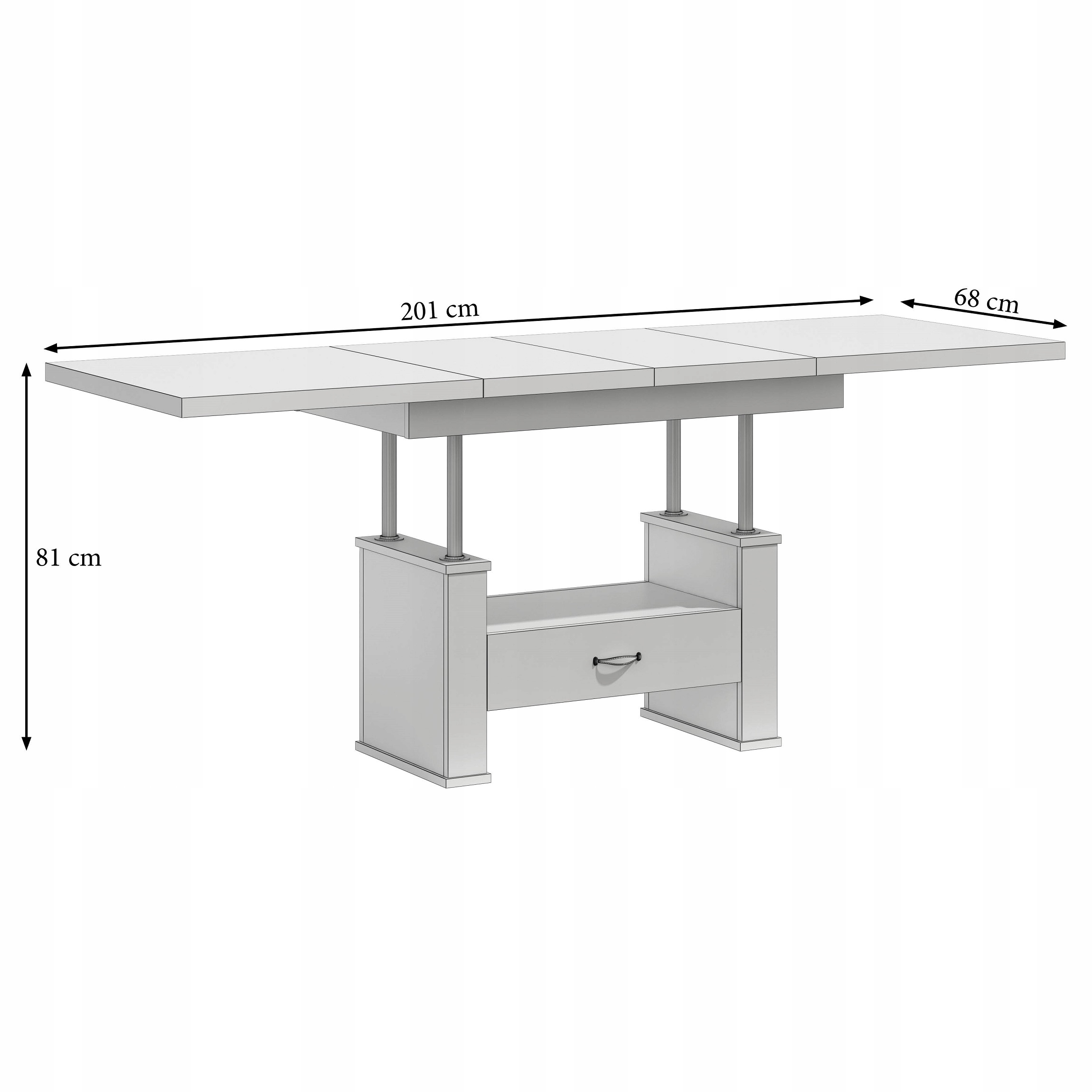 Oferujemy Państwu wysokiej jakości ławo - stół zaprojektowany z myślą o kompleksowym wykorzystaniu powierzchni małych pokoi. Ława posiada funkcję rozkładania na prowadnicy linkowej ciągnąc za jedną połówkę blatu druga rozciąga się samoczynnie oraz podnoszenia.na podnośnik czteropunktowy .Sprawdzi się zarówno jako stolik kawowy jak i stół dla całej rodziny w czasie niedzielnego obiadu.Ława jest wykonana z płyty obustronnie laminowanej. Materiał ten charakteryzuje się zwiększoną odpornością na uszkodzenia mechaniczne, zarysowania, oddziaływanie wysokich temperatur. Nie zaszkodzi mu gorąca szklanka postawiona bezpośrednio na blacie.Krawędzie blatu wykończone są obrzeżem PCV zabezpieczającym elementy ławy przed uszkodzeniami mechanicznymi.Wkładki nie mieszczą się pod blatem chowamy osobno.